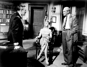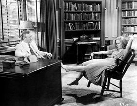 左圖:白夏娃 (珍妮華德)望著憑空而來的成堆嶄新衣物,不知如何與丈夫勞夫 (大衛韋恩)解釋。 右圖:黑夏娃在診療途中突然浮現,和盧瑟醫生 (李傑柯伯)一見如故,恣意於辦公室暢談。