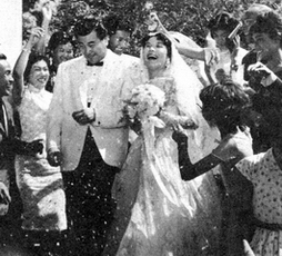 左圖:潔芸與羅守禮 (喬宏)歡喜結婚,聽聞鞭炮聲卻誤以為槍擊,心驚膽跳。 右圖:黃玫瑰 (歐陽莎菲)誤會潔芸外遇,至林寓通報,志良 (吳家驤)提供照片指認,證實潔芸與周玉同車。