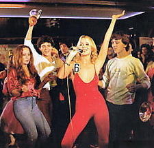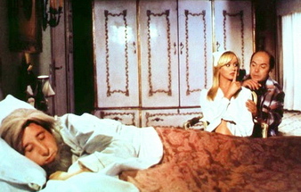 (左) 尼可拉 (李諾班菲)不知床上人為助理冒充,施打藥物使之酣睡,以便一親安琪拉 (葛蘿莉姬妲)芳澤。(右) 安琪拉趁隙至俱樂部參加比賽奪冠,為眾獻唱,與年輕男女熱舞。