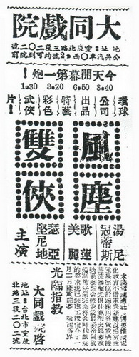 大同是家很「彈性」的戲院,它主要可以歸類到二、三輪戲院,但起初它也曾首輪過各種電影,接著則有多種映片方式:「一票兩片」、西片二輪、名片三輪、台語片首輪、華語片首輪等等。由於大同戲院在電影版的廣告多半自成一格,且後期往往不在主版面(排在他版廣告),目前所能得到大同戲院最晚至1988年六月仍有放映西片,且可能於該年歇業。