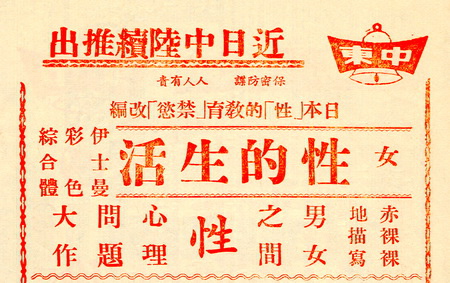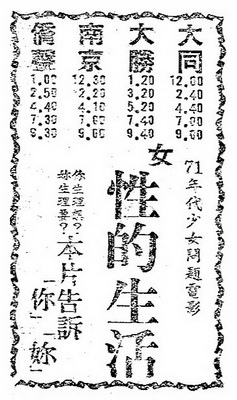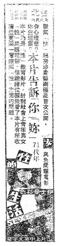 (左)起初的宣傳文案標榜本片是性教育電影:「本片乃是『性』教育影片,針對社會上青年男女『性』問題電影,保證諸位觀眾看了本片有所收穫並更深一層瞭解『性』方面的問題。」