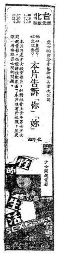(右)數天後卻更換成為少女教育電影:「本片乃是少女教育影片,針對社會上青年男女少女問題電影,保證諸位觀眾看了本片有所收穫並更深一層瞭解男女間的問題。」