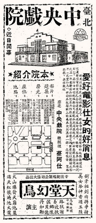 中央戲院位於台北市太原路115巷28號,經營者乃是發跡於承德路的大稻埕實業家蔡阿仕,院內設有1032個座位,觀眾席為單層設計,影廳狹長。1951年10月12日,中央戲院開幕,當天首映福斯出品、路易佐丹(Louis Jourdan)、狄波娜貝姐(Debra Paget)與謝扶陳德勒(Jeff Chandler)主演的彩色歷險影片《天堂幻鳥》(Bird of Paradise, 1951)。